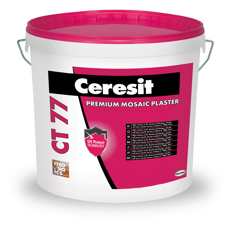 Mozaiková omítka Ceresit CT 77 je špičkové dekorativní řešení pro stěny v interiéru i exteriéru, navržené pro náročné podmínky a vysoké estetické nároky. Díky vysoké odolnosti vůči UV záření, oděru a mechanickému poškození je ideální volbou pro plochy se zvýšeným zatížením – ať už se jedná o sokly, vstupní portály, chodby nebo balustrády.