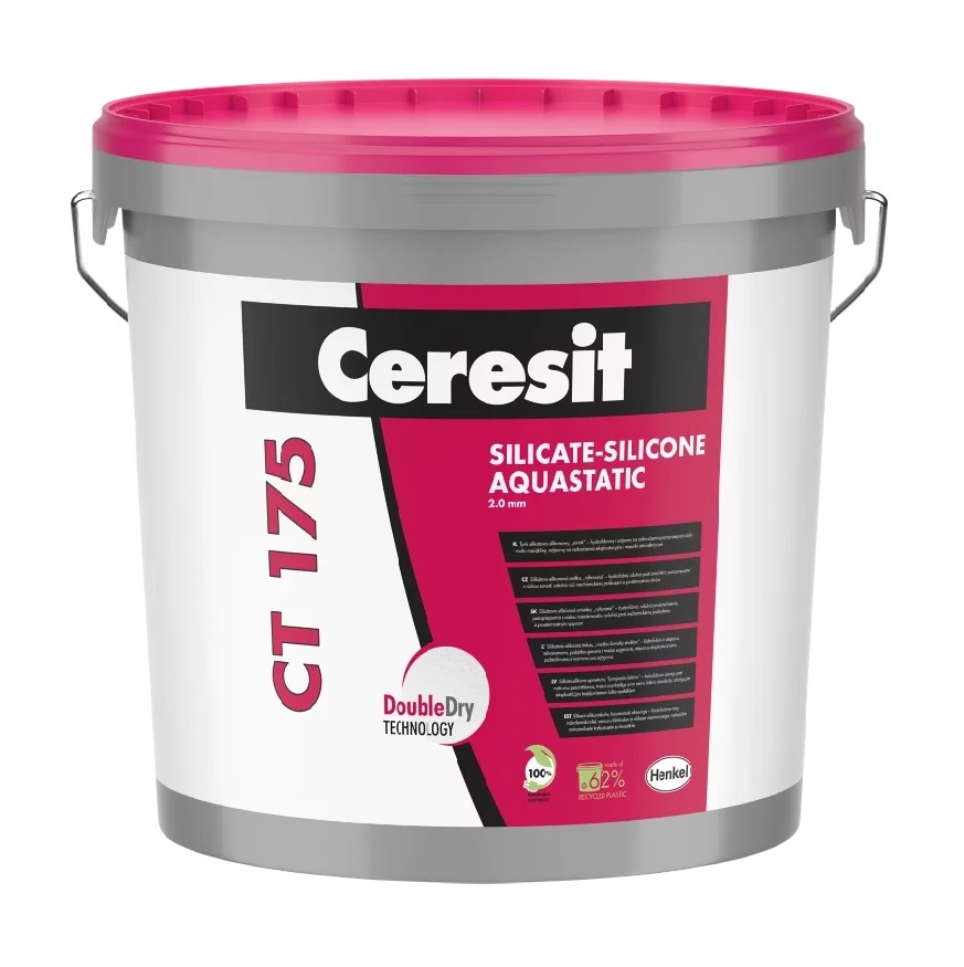 CERESIT® CT 175 je dekorativní tenkovrstvá silikátově-silikonová omítka s rýhovanou strukturou ve velikosti zrna 2,0 mm. Je určena pro použití v exteriéru i interiéru a spojuje výhody silikátových a silikonových omítek – vysokou paropropustnost, nízkou nasákavost a odolnost proti znečištění. Díky hydrofobním vlastnostem a technologii BioProtect je omítka vysoce odolná proti biologickému napadení plísněmi, řasami a houbami. Je vhodná pro betonové podklady, tradiční omítky a jako povrchová úprava v kontaktních zateplovacích systémech Ceresit Ceretherm (ETICS) s deskami z EPS nebo MW. Balení: 25 kg.