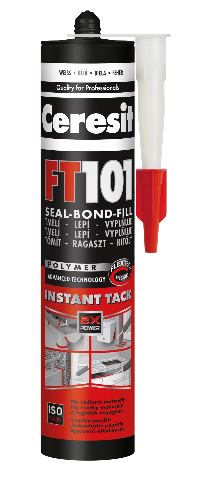 Jednosložkový tmel CERESIT FT 101 je víceúčelový elastický lepicí a těsnicí tmel založený na technologii MS polymeru Flextec. Vytvrzuje se absorbováním vzdušné vlhkosti. Je vhodný jak pro interiér, tak exteriér, a lze jej použít při montáži okenních parapetů, podlahových lišt, schodů, dlaždic, spojování kovových a dřevěných konstrukcí, rozvodů ventilace a klimatizace, i pro spáry mezi okenními rámy a zdivem. Uplatní se také u dilatačních spár v podlahách a stěnách na balkonech, terasách a bazénech. Tmel je odolný vůči ozónu a UV záření, a hodí se na tmelení i lepení. Balení: šedá barva, 280 ml.