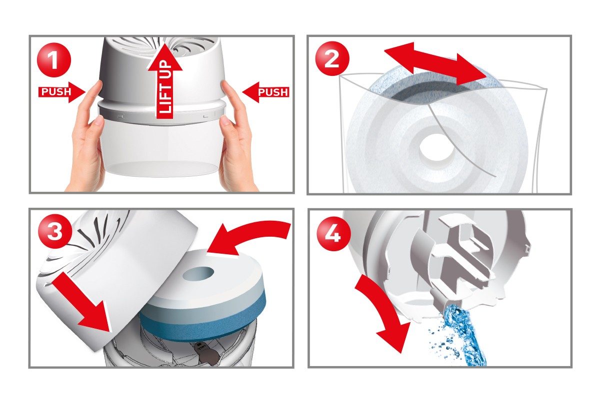 Jedinečný design pohlcovače vlhkosti AERO 360° Koupelna vytváří vynikající průtok vzduchu přístrojem. Výsledek: tableta je v kontaktu se vzduchem, což zvyšuje efektivitu absorpce vlhkosti. Ultra absorpční členitá AERO 360° tableta s aktivním krystalem pro vynikající pohlcování vlhkosti a účinnou neutralizaci zápachu zvyšuje absorpční výkon přístroje. Vzdušná vlhkost se uvnitř přístroje přeměňuje na slaný roztok, který je shromažďován ve sběrné nádobě zařízení. Pohlcovač vlhkosti AERO 360° Koupelna je ideální pro koupelny s rozlohou okolo 10 m2 a špatnou cirkulací vzduchu. Do větších místností použijte vice přístrojů. Návod k použití naleznete v technickém listu, který se nachází pod obrázky v sekci ke stažení.