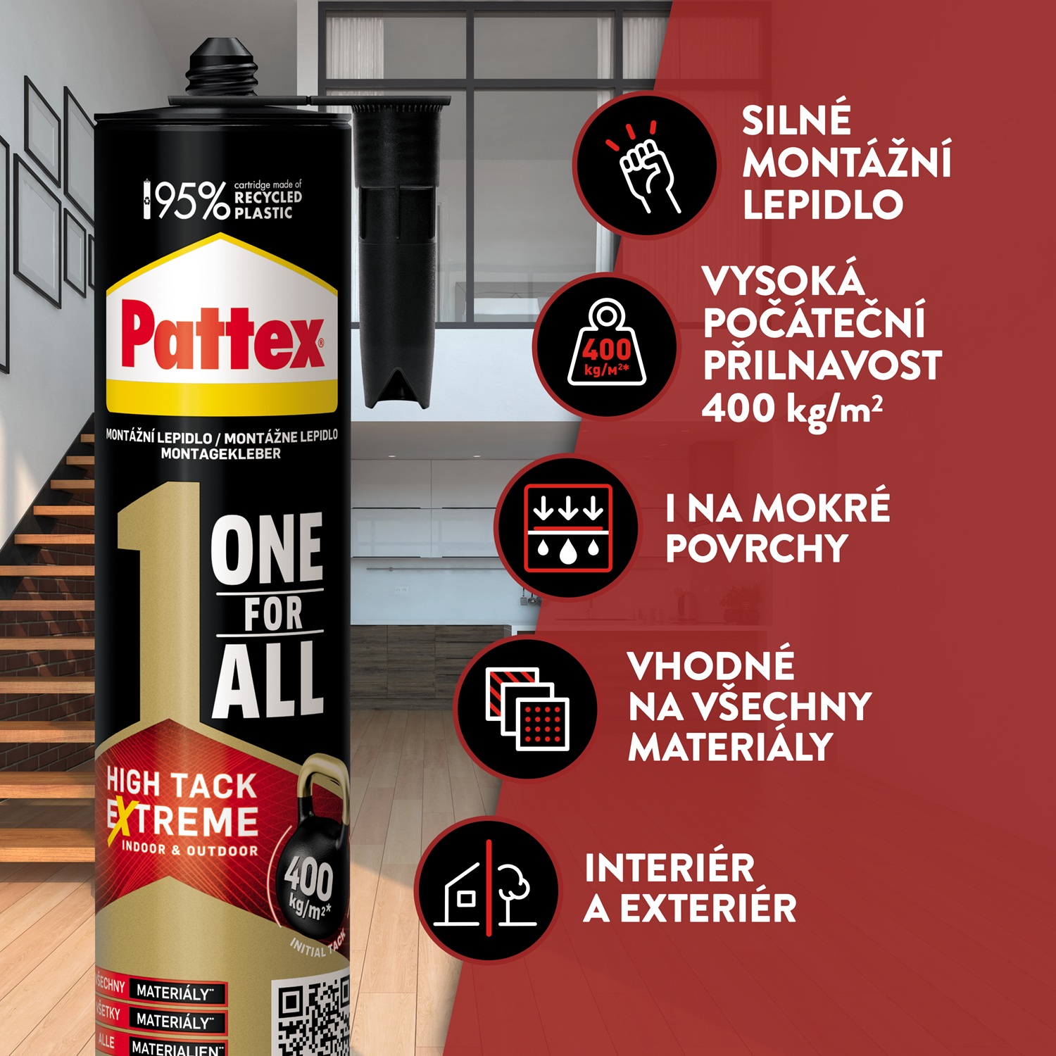 Pattex ONE FOR ALL Instant Tack je jednosložkové montážní lepidlo pro interiér i exteriér, které díky technologii FlexTec® nabízí počáteční pevnost až 400 kg/m². Je vhodné pro pevné a spolehlivé spojení bez nutnosti mechanického upevnění. Nestéká, nepropadá se a spoj lze několik minut po aplikaci ještě upravit. Po vytvrzení je přetíratelné, brousitelné a vyplňuje drobné trhliny. Tlumí vibrace a zvuk.