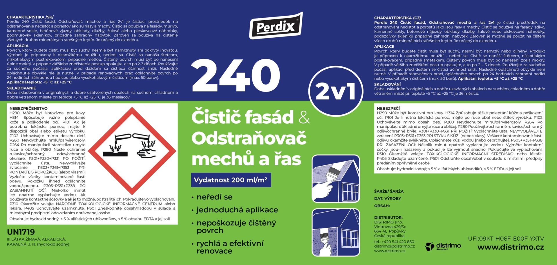 Perdix 240 Čistič fasád & Odstraňovač mechů a řas 2v1 je spolehlivý prostředek pro účinné odstranění nečistot, mechů a řas z různých venkovních povrchů. Skvěle se hodí na fasády, zdivo, kamenné sokly, betonové nájezdy, dlažby, obklady, ale i na žulové a pískovcové náhrobky, zahradní nábytek nebo střechy z pálených, betonových i cementovláknitých krytin.