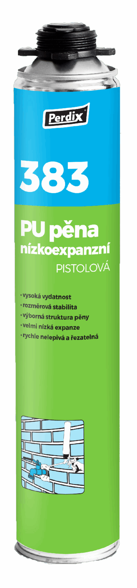 Perdix 383 PU pěna nízkoxpanzní pistolová je montážní a těsnicí polyuretanová hmota, která napěněním a vytvrzením reaguje na vlhkost vzduchu. Je ideální pro aplikace vyžadující nízkou expanzi vytvrzené pěny a pro lepení různých stavebních materiálů. Vhodná pro lepení a instalaci schodnic, okenních parapetů, montáž a těsnění dřevěných, plastových a kovových rámů oken, dveřních zárubní a dalších konstrukcí. Používá se také k utěsnění spár, prasklin a prostupů instalací vody, topení, plynu a elektřiny. Nepřilne k povrchům PE, PP, teflonu a silikonu.