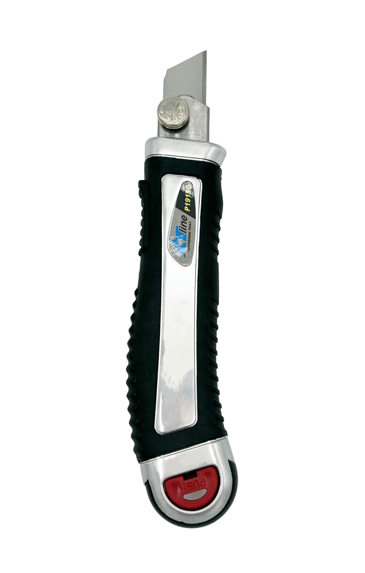 Celokovový ulamovací nůž s kovovou vodící lištou a pogumovanou rukojetí s drážkami proti skluzu. Ocelové vodítko (vysouvač) čepele se vždy automaticky uzamkne proti pohybu a umožňuje rychlou výměnu náhradní čepele přímo ze zásobníku. Zásobník obsahuje 5 náhradních čepelí.