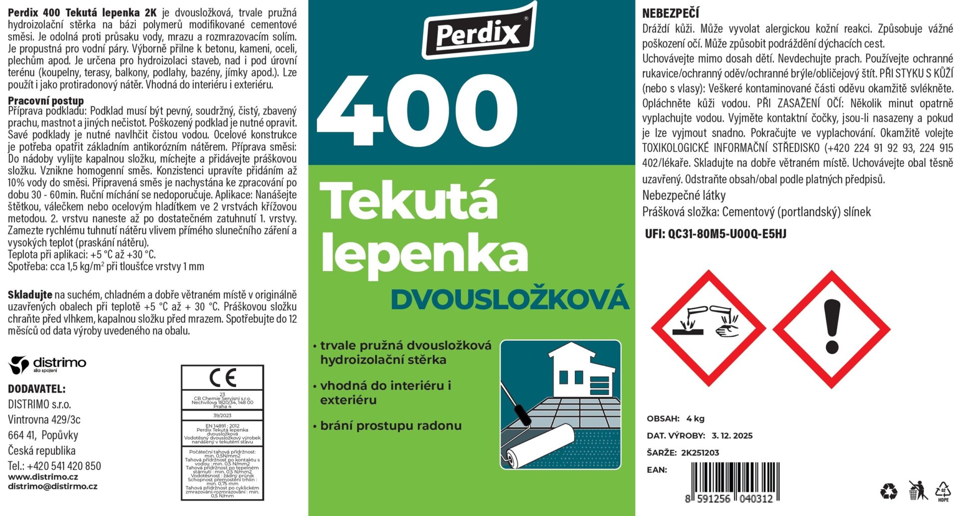 Perdix Tekutá lepenka 2K je dvousložková pružná hydroizolační hmota, která po smíchání kapalné a sypké části vytvoří plastickou, tixotropní a velmi snadno aplikovatelnou směs. Po vytvrzení vzniká spolehlivá hydroizolační membrána, která brání prosakování vody pod hydrostatickým tlakem a zároveň nepropouští vlhkost. Hmota je dostupná v šedé barvě a díky mikroporézní struktuře umožňuje prostup vodních par, aniž by podporovala kondenzaci.